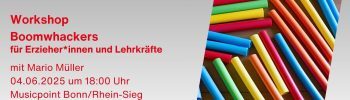 Workshop: Boomwhackers für Erzieher*innen und Lehrkräfte 18:00 – 19:304. Juni 2025 Mit Boomwhackers zum Mitmachen animieren! Entdeckt in unserem mitreißenden Boomwhackers-Workshop für Erzieher*innen und Grundschullehrkräfte, wie einfach und wirkungsvoll gemeinsames Musizieren mit einer Gruppe sein kann! In diesem praxisnahen Kurs zeigen wir euch spielerische Methoden, um Kinder mit Imitations- und Bewegungsspielen sowie einfachen Liedern für … Workshop: Boomwhackers für Erzieher*innen und Lehrkräfte weiterlesen