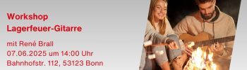 Workshop: Lagerfeuer-Gitarre 14:00 – 15:307. Juni 2025 Du beherrschst bereits einige Akkorde und Schlagmuster und liebst es, gemeinsam Musik zu machen? Dann ist unser Lagerfeuer-Gitarren-Workshop genau das Richtige für dich! In entspannter Runde spielen, singen und üben wir zusammen Klassiker wie „Take Me Home, Country Roads“ oder „Lady In Black“ – perfekt für die nächste Session am Lagerfeuer! Für wen? Alle … Workshop: Lagerfeuer-Gitarre weiterlesen